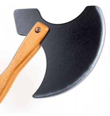 9,95 €Ce jouet en bois est une hache médiévale de la marque Kalid Medieval. L\'arme factice est constituée d\'un manche en bois massif et d\'un lame en MDF peinte en noir avec un bord gris.